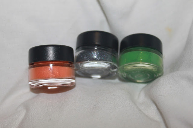 I really love BarryM Dazzle dusts. I have almost 40, and I plan to swatch every single one for you. These were the first ones that where in my reach. Orange, Silvery Black and Parrot Green. I love using  BarryM for fancy dress/show make up. I do a lot of shows and attend a lot of dress up parties and these really do the trick. What I love about BarryM Dazzle Dusts is how buildable they are. I find that they're slightly sheer to begin with, but I'm always able to build the colour so it's more intense. BarryM Dazzle Dusts are my favourite 'colourful' eye shadows on the high street, at only £4.59 a pop you can't complain. I don't tend to use them for everyday make up, but I love them for more fun looks. You get so much colour in the pot too, they really are a god send. When using these I always wear primer, and I always have trouble with fall out when applying. Once applied though, I have no problem with fall out. Here are the swatches from these 3 colours.
